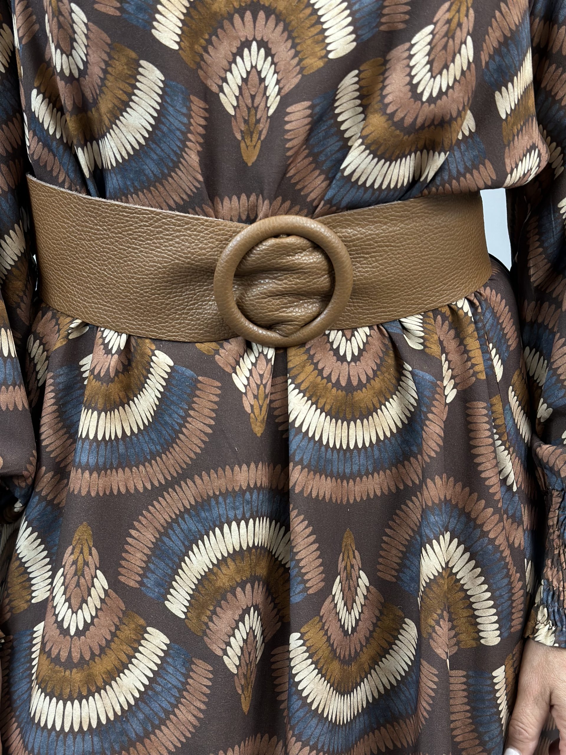 Snyggt bälte i skinn med runt klätt spänne. Onesize