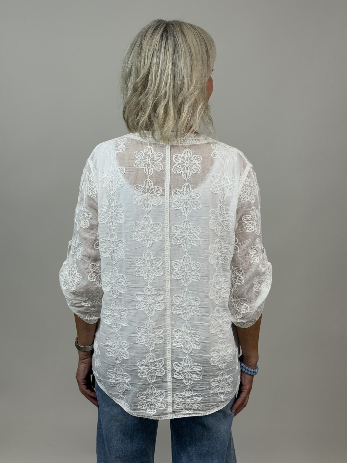 Mycket fin helknäppt bomullsblus i spets med virkad kant. Blusen är v-ringad och har praktisk knappslå i ärm som gör att du kan variera ärmlängden på ett bra sätt.