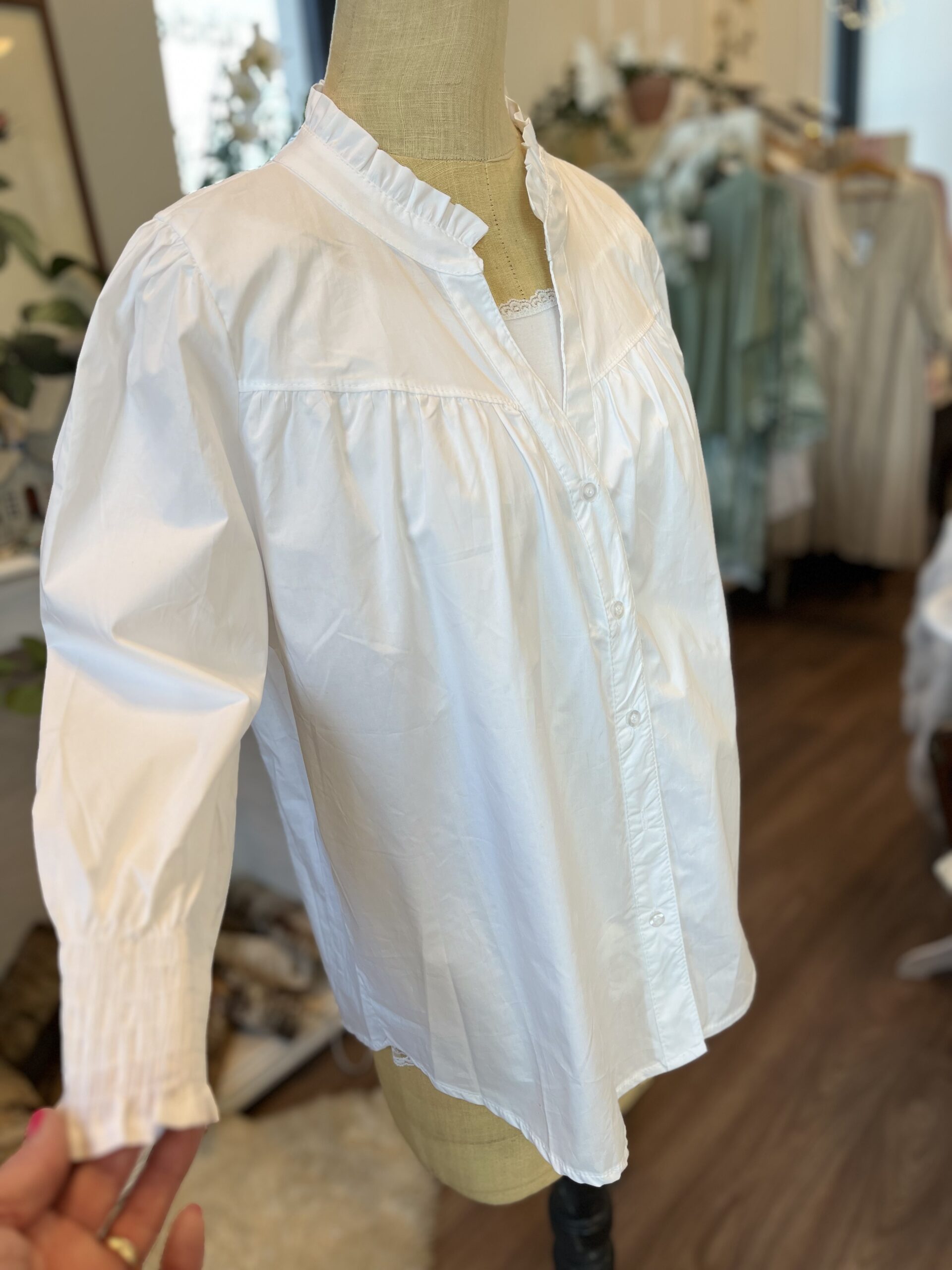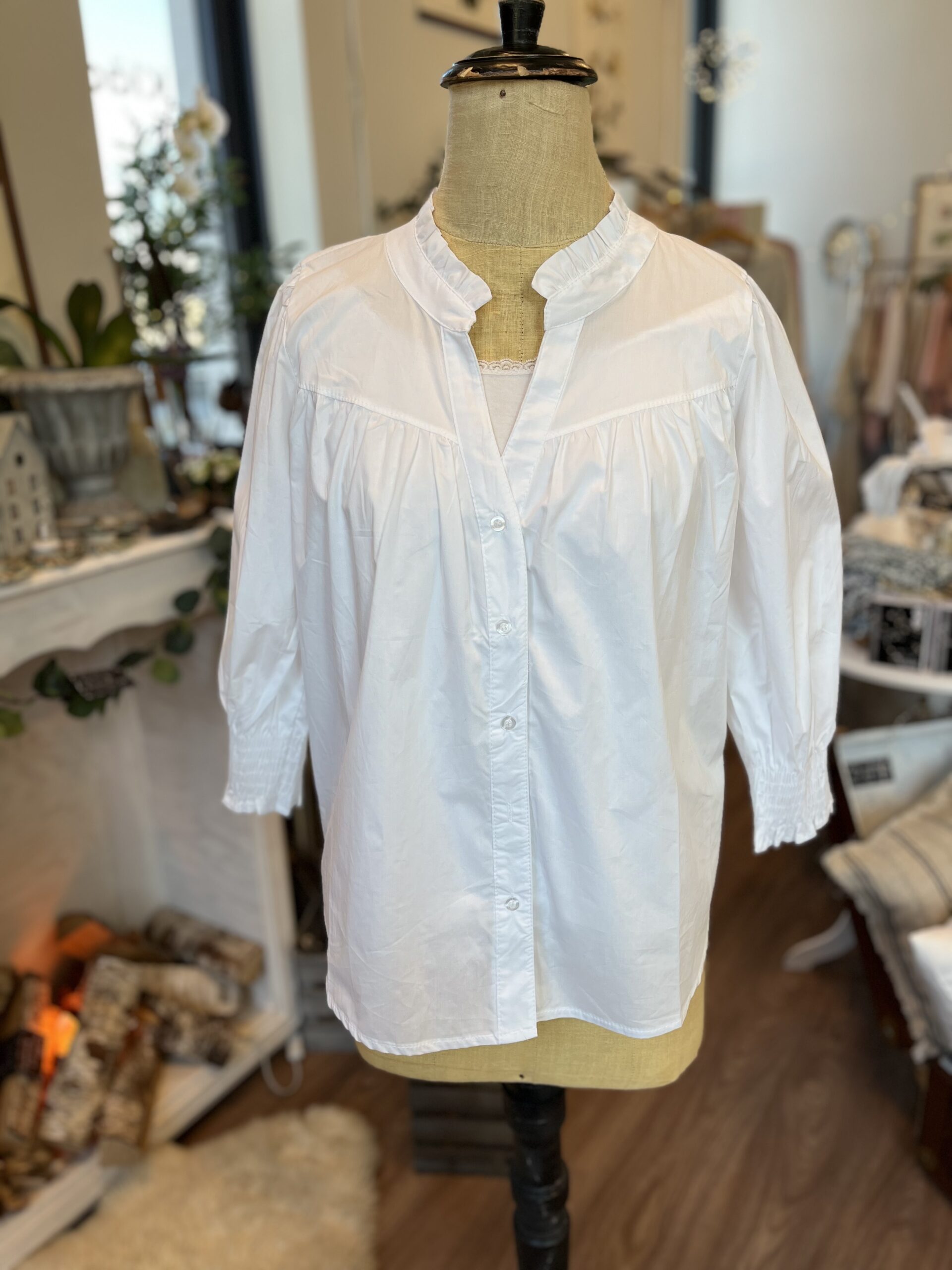 Härlig blus i 100% bomull med vackert rynk i hals, knappar hela vägen och ärm i trekvart med snygg smock vid ärmslutet.