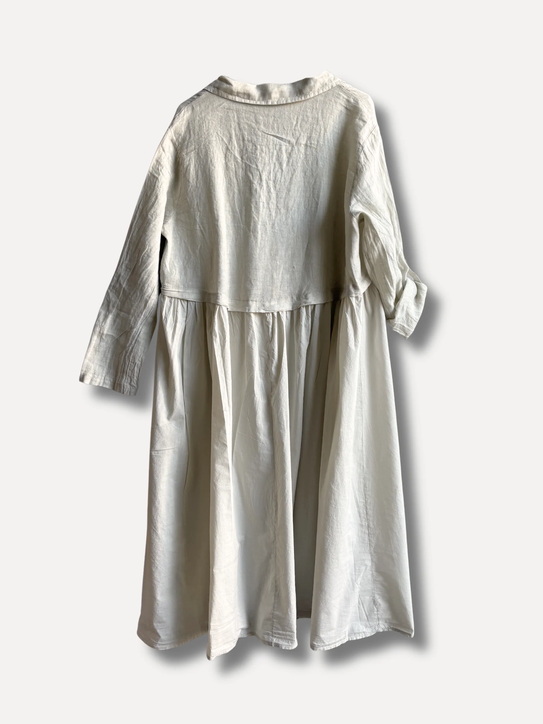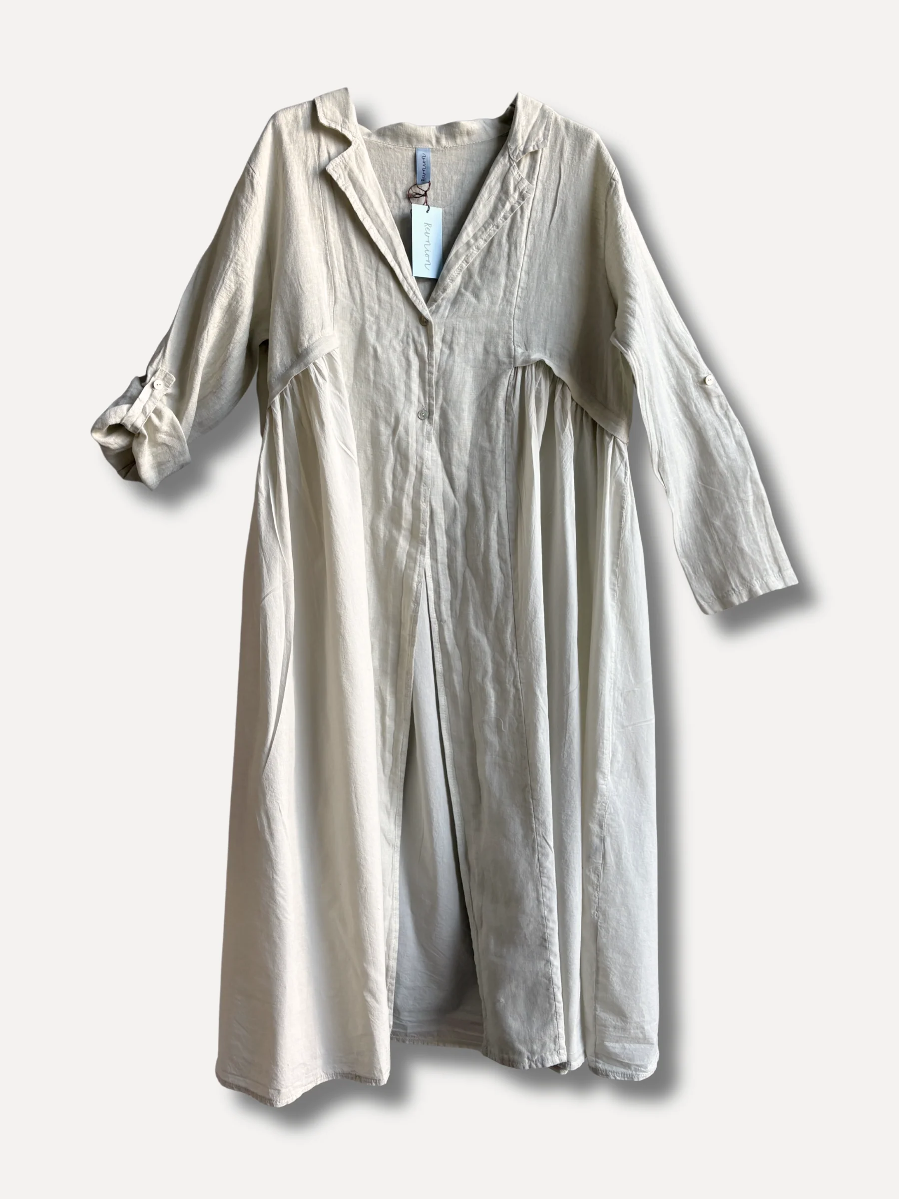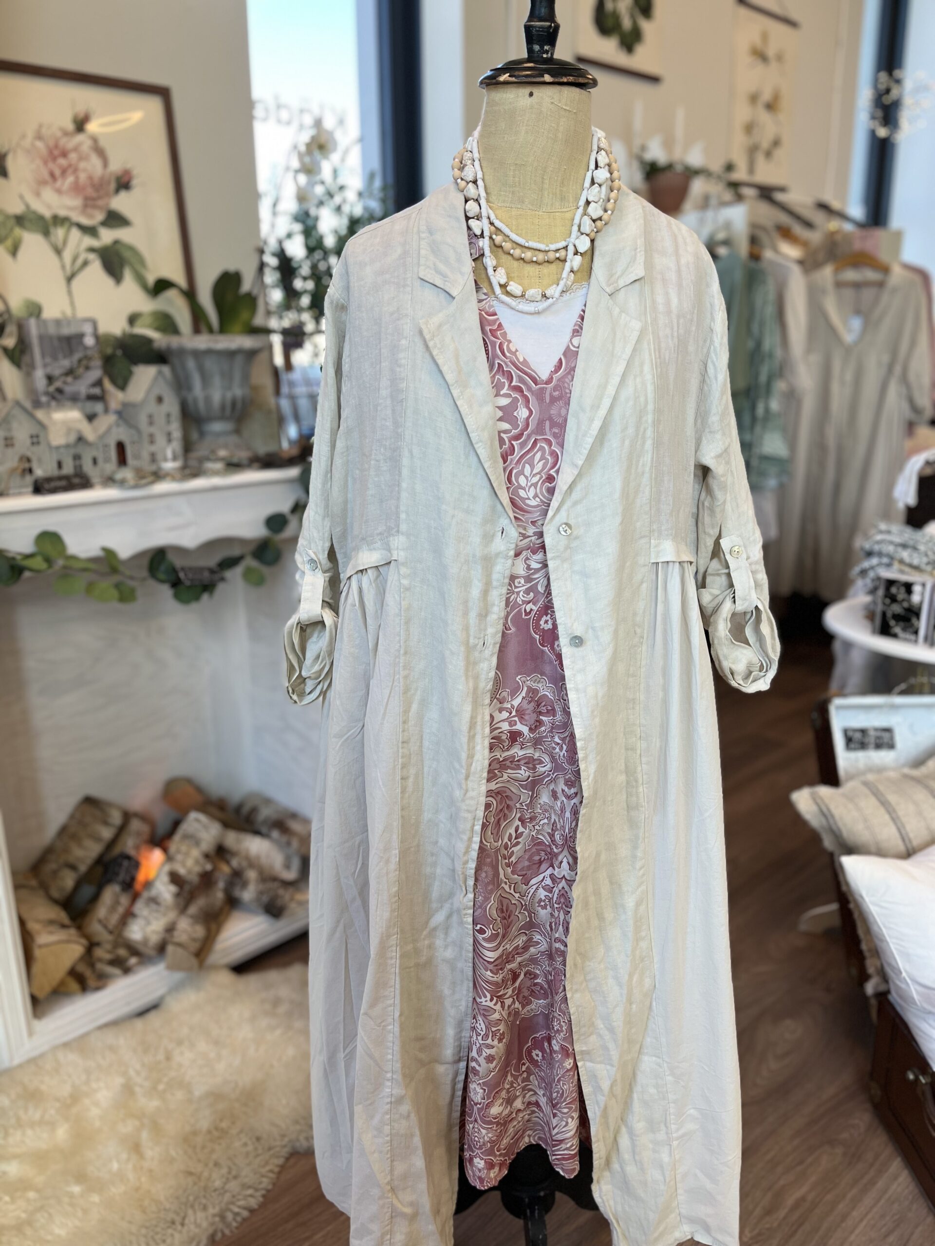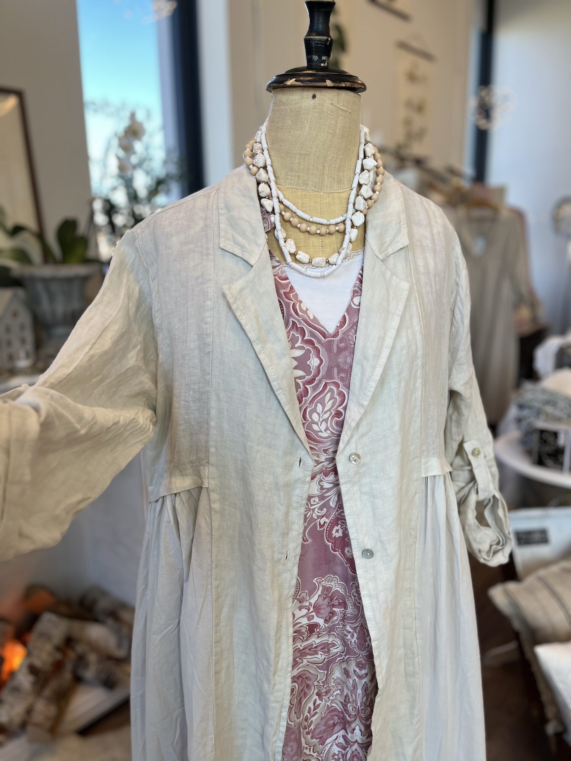 Lång snygg kappa i linnemix med vackert fall. Fin att bära både till byxor och klänning, såväl öppen som stängd. Kappan har snyggt slag upptill och fint snitt nedtill. Praktisk knappslå gör att du kan variera längd på ärmarna.
