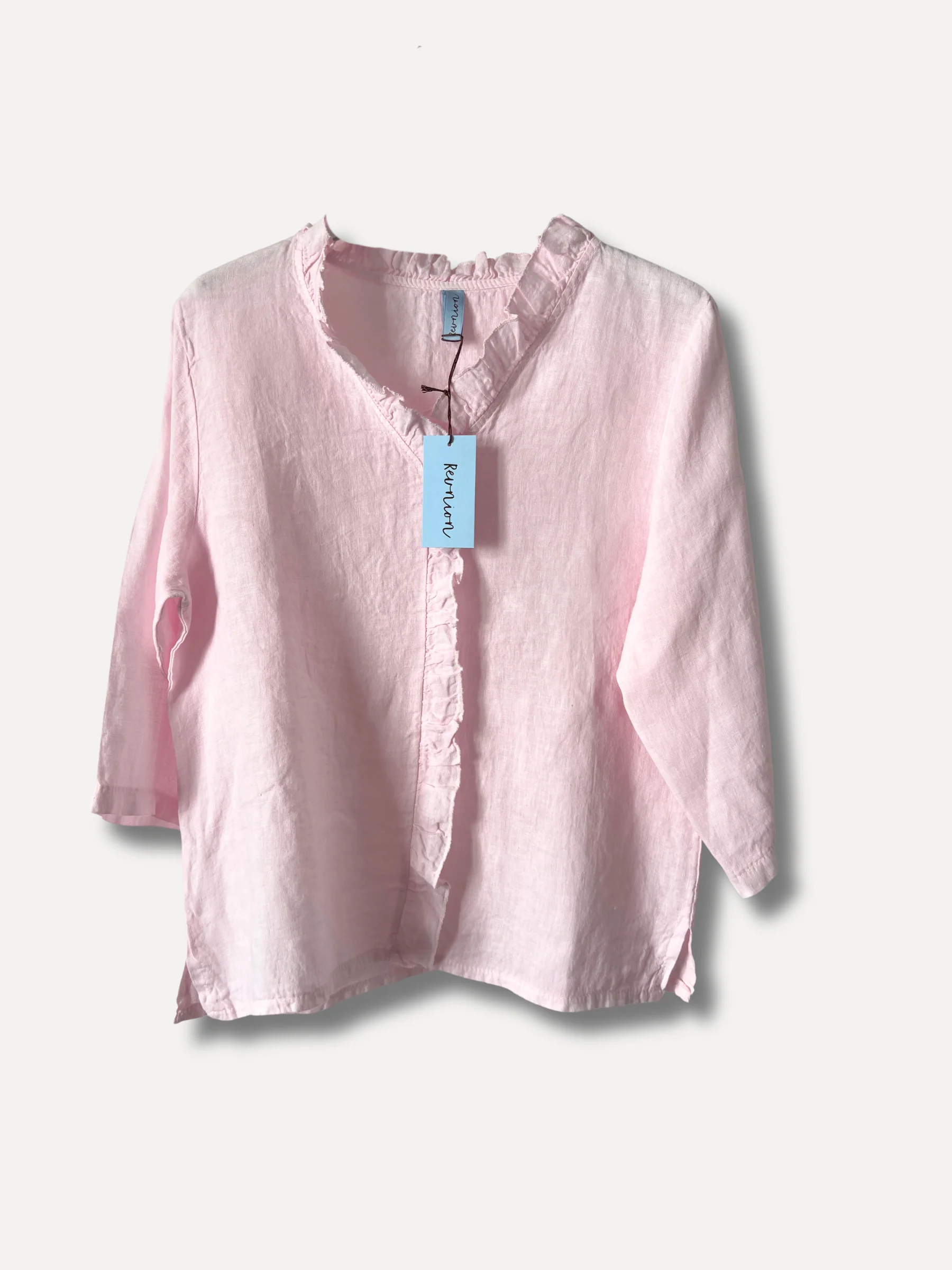 Ljuvlig blus i 100% linne med volangkrage som följer längs framsidan. Onesize.