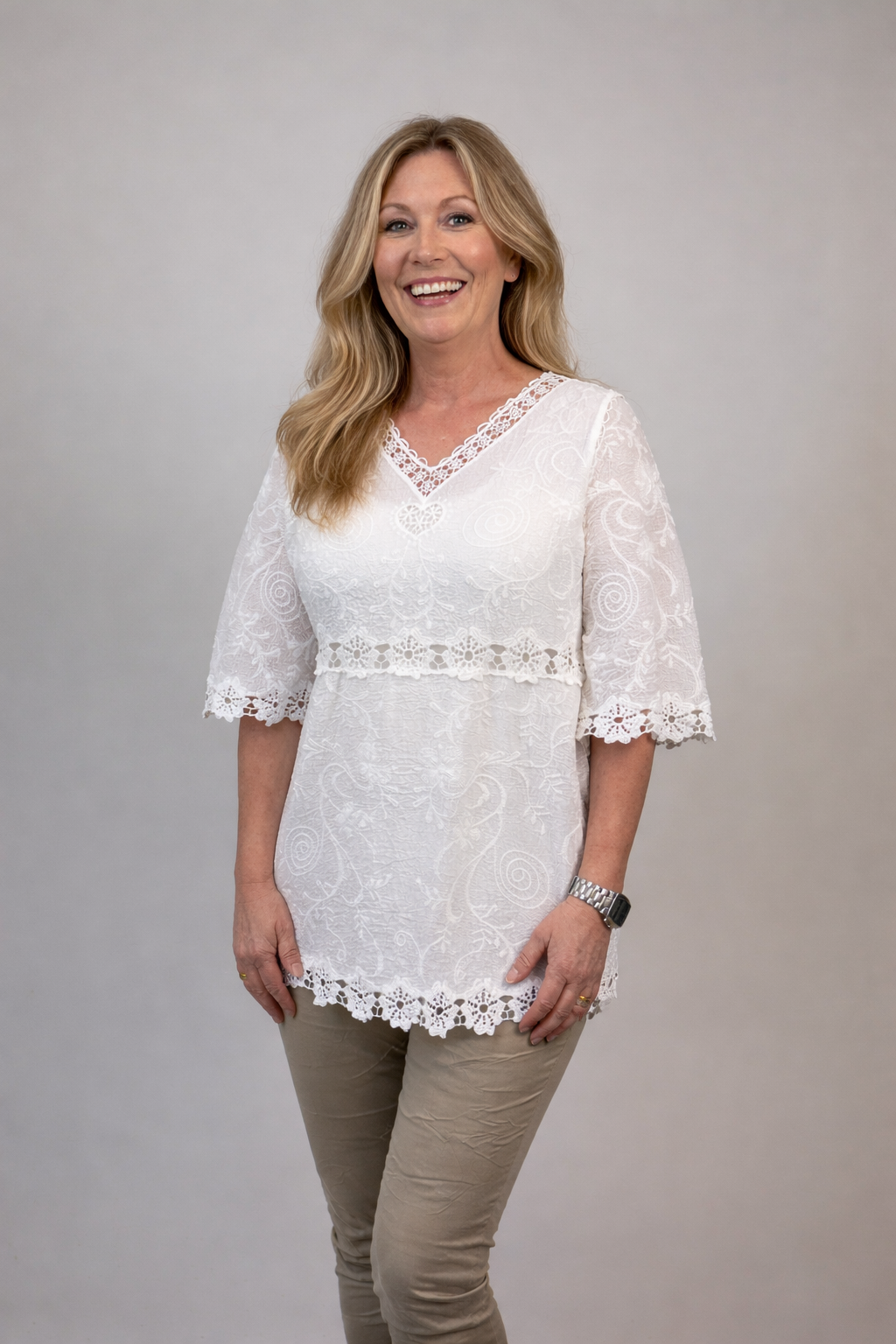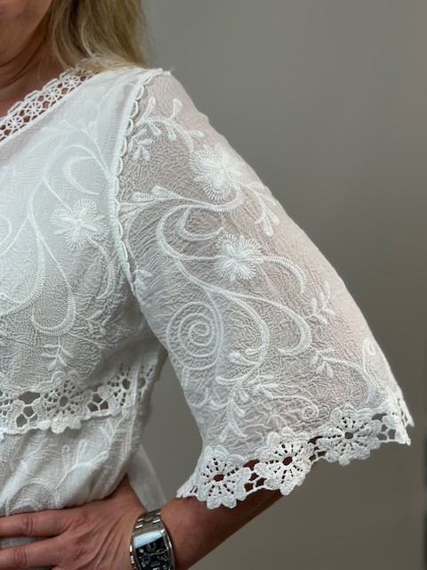 Vacker V-ringad blus med virkade detaljer och brodyr. Blusen är tillverkad i 100% bomull och har snygg ärm i trekvart. Onesize.
